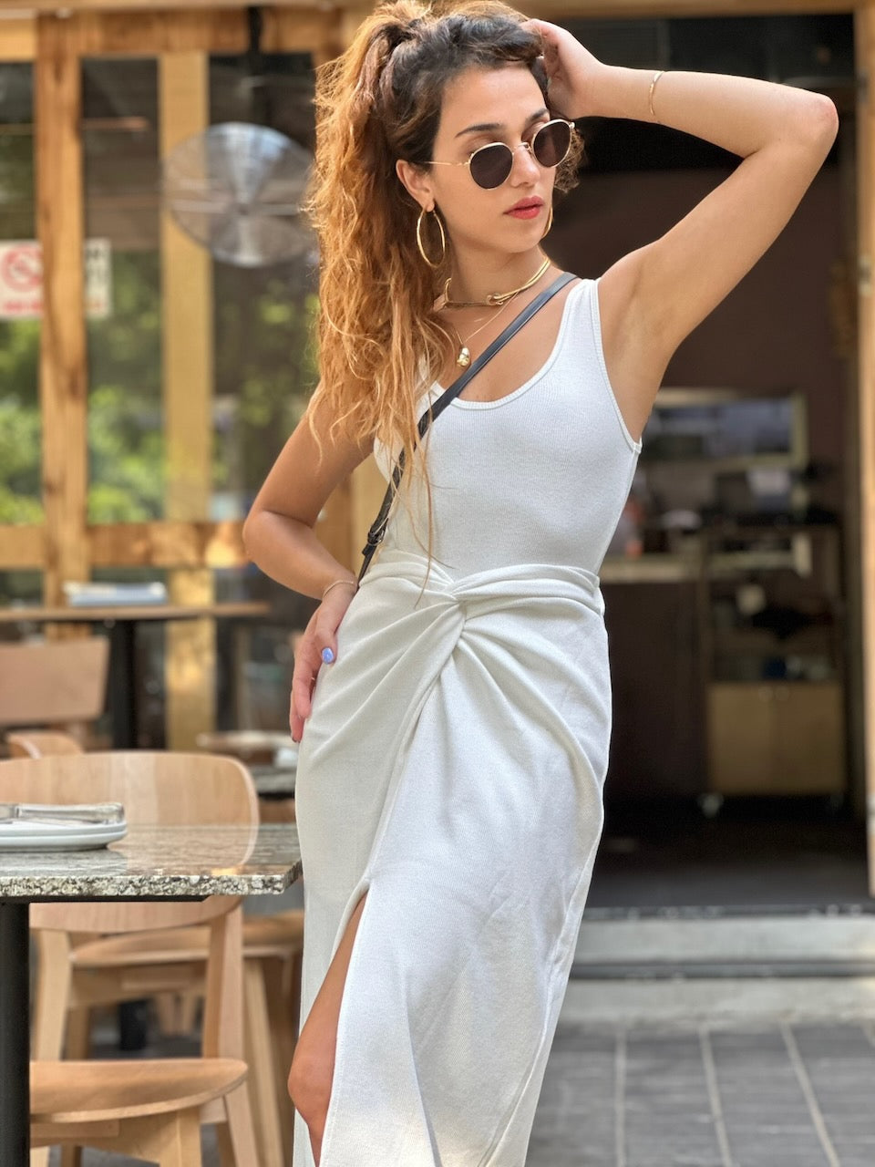 חצאית ישרה באורך 7/8 עם שסע קידמי, גומי בגב, בחלקה הקדמי מתחברים שני הצדדים בליפוף היוצר קפלים אלכסוניים שמחמיאים ומטשטשים את איזור הבטן.